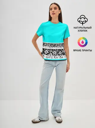 Женская футболка оверсайз / Цветочный бирюзовый узор