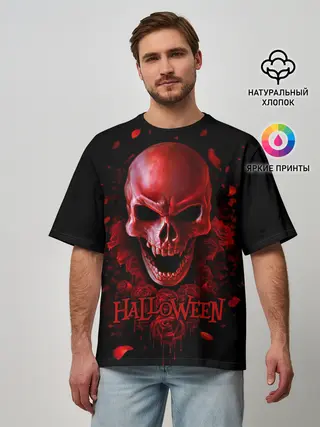 Мужская футболка оверсайз / Красный череп в кровавых розах