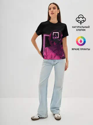 Женская базовая футболка / ИГРА В КАЛЬМАРА НЕОН, СТРАЖ КВАДРАТ 029