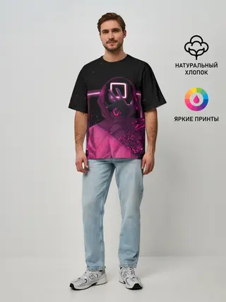 Мужская футболка оверсайз / ИГРА В КАЛЬМАРА НЕОН, СТРАЖ КВАДРАТ 029