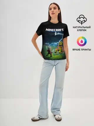 Женская базовая футболка / Бой Стива с Крипером под ударом молнии