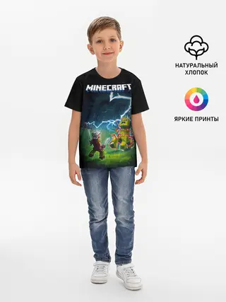 Детская базовая футболка / Бой Стива с Крипером под ударом молнии