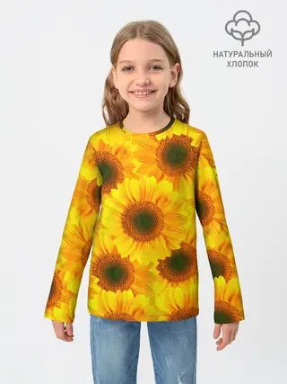 Лонгслив женский. Хлопок / Принт подсолнухи желтый