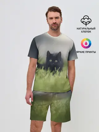 Мужской костюм с шортами / черный кот на лугу