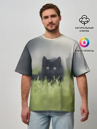 Мужская футболка оверсайз / черный кот на лугу