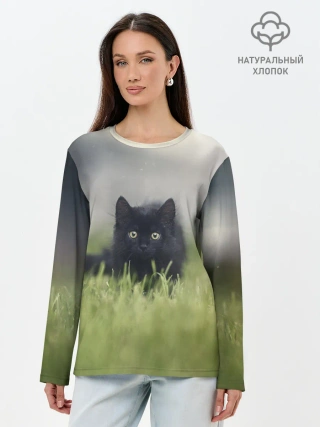 Лонгслив женский. Хлопок / черный кот на лугу