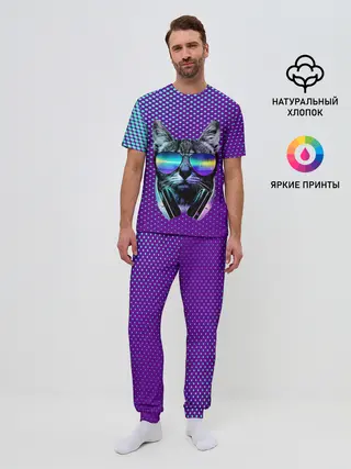 Мужская пижама с брюками / Кот очки наушники модный
