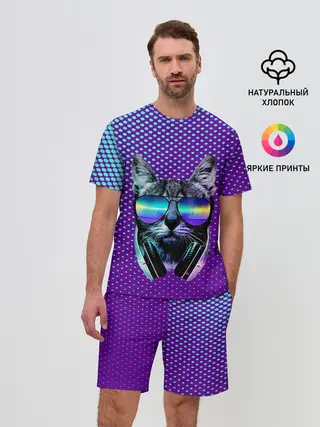 Мужской костюм с шортами / Кот очки наушники модный