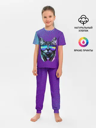 Детская пижама с брюками / Кот очки наушники модный