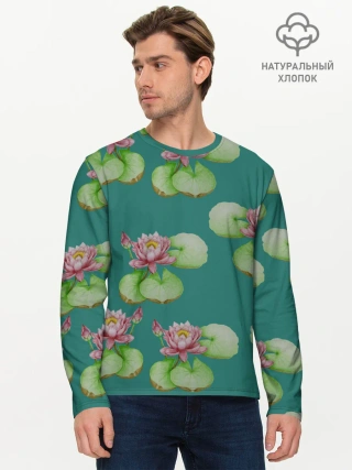 Мужской лонгслив базовый / Лотосы на темно бирюзовом фоне