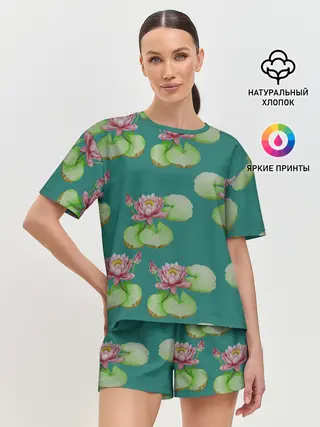 Женская пижама с шортами / Лотосы на темно бирюзовом фоне