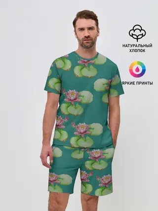 Мужской костюм с шортами / Лотосы на темно бирюзовом фоне