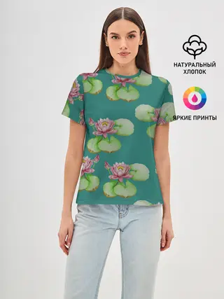 Женская базовая футболка / Лотосы на темно бирюзовом фоне