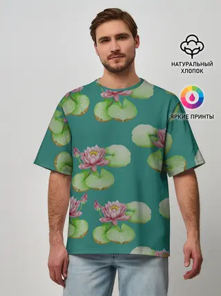 Мужская футболка оверсайз / Лотосы на темно бирюзовом фоне
