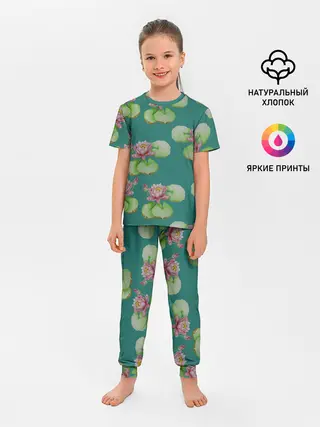 Детская пижама с брюками / Лотосы на темно бирюзовом фоне