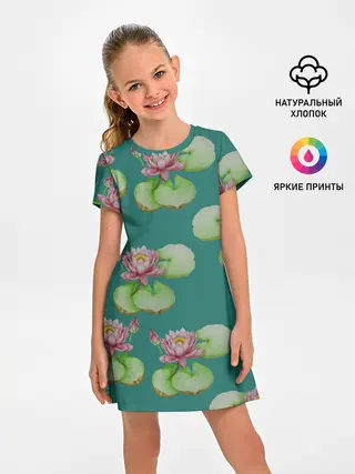 Детское платье / Лотосы на темно бирюзовом фоне