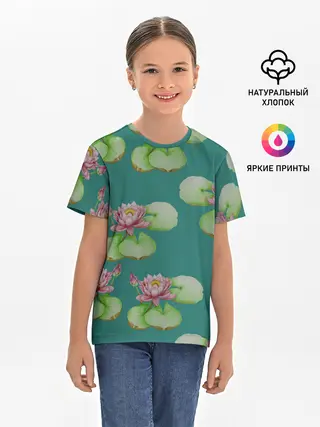 Детская базовая футболка / Лотосы на темно бирюзовом фоне