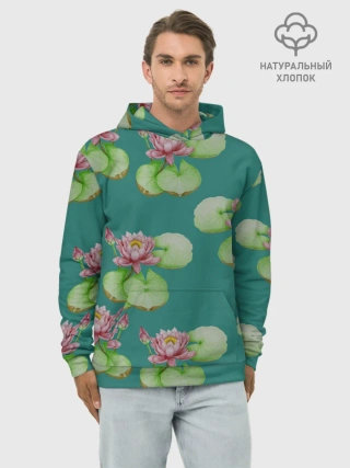 Худи мужской база хлопок / Лотосы на темно бирюзовом фоне