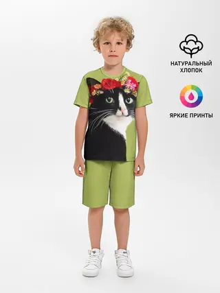 Детская пижама с шортами / Кот и цветы