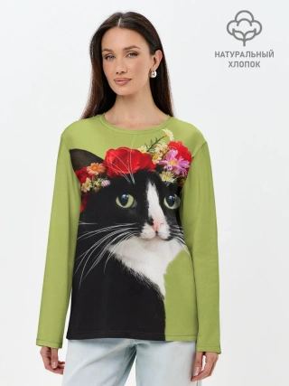 Лонгслив женский. Хлопок / Кот и цветы