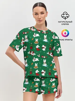 Женская пижама с шортами / Новогодний паттерн с зайчиками