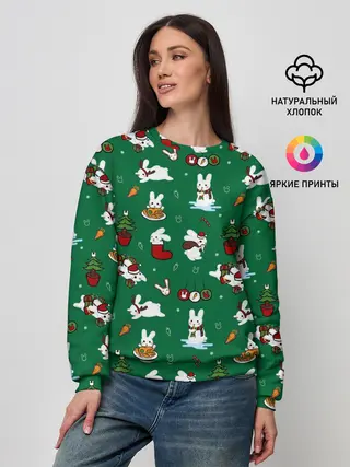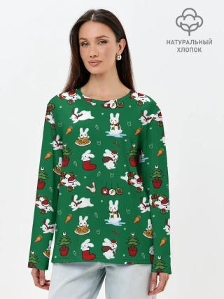 Лонгслив женский. Хлопок / Новогодний паттерн с зайчиками
