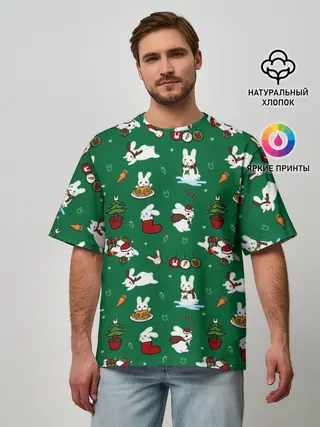 Мужская футболка оверсайз / Новогодний паттерн с зайчиками