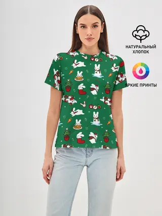 Женская базовая футболка / Новогодний паттерн с зайчиками