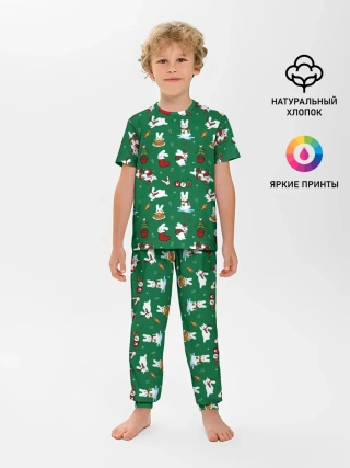 Детская пижама с брюками / Новогодний паттерн с зайчиками