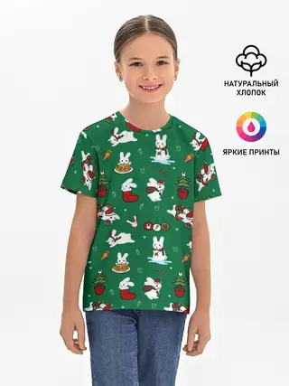 Детская базовая футболка / Новогодний паттерн с зайчиками