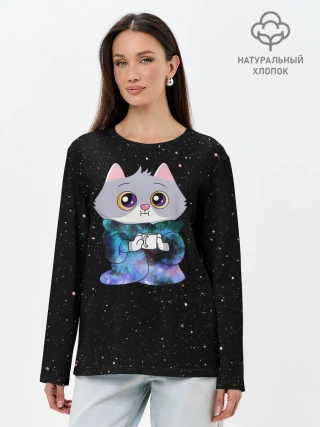 Лонгслив женский. Хлопок / Котёнок в пледе