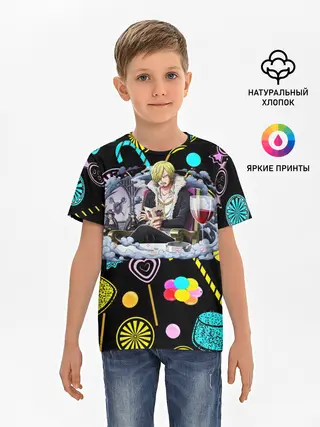 Детская базовая футболка / Винсмок Санджи. Фон со сладостями