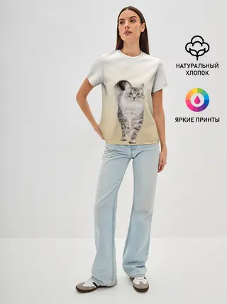 Женская базовая футболка / Пушистый котик реалистичный