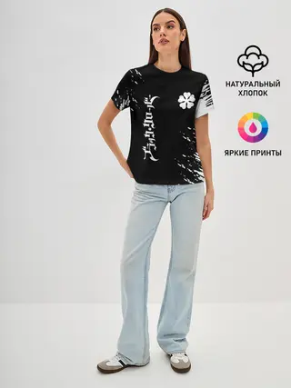 Женская футболка оверсайз / Белый логотип Черный клевер на черном
