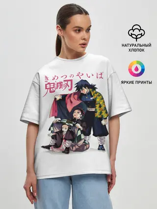 Женская футболка оверсайз / Танджиро и Незуко под укрытием Гию