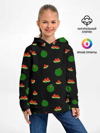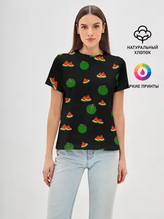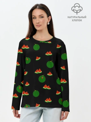 Лонгслив женский. Хлопок / Арбуз на черном фоне