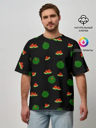 Мужская футболка оверсайз / Арбуз на черном фоне