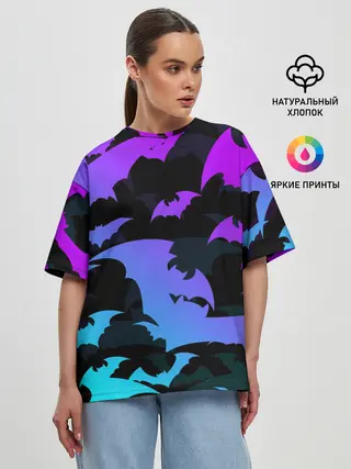 Женская футболка оверсайз / ЛЕТУЧИЕ МЫШИ ХЕЛЛОУИН НЕОН / HALLOWEEN NEON