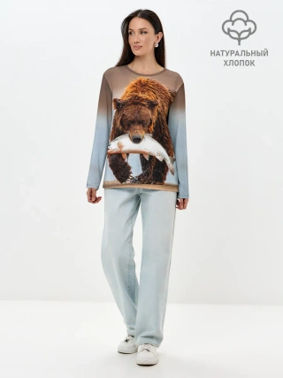 Лонгслив женский. Хлопок / Медведь с рыбой во рту