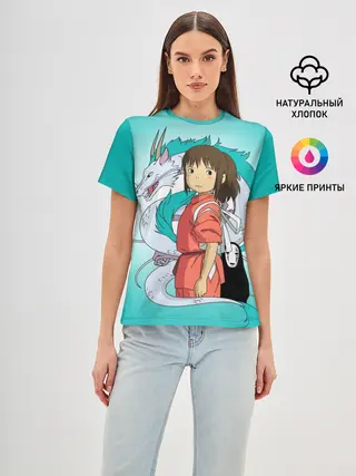 Женская базовая футболка / Тихиро и Хаку зеленый фон