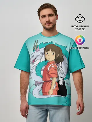 Мужская футболка оверсайз / Тихиро и Хаку зеленый фон
