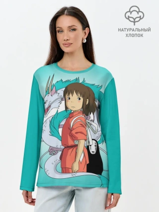 Лонгслив женский. Хлопок / Тихиро и Хаку зеленый фон