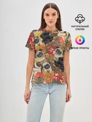 Женская базовая футболка / Мопсики | Цветочки