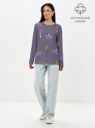 Лонгслив женский. Хлопок / Цветы шафрана на фиолетовом