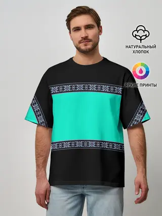 Мужская футболка оверсайз / Черно-бирюзовый узор