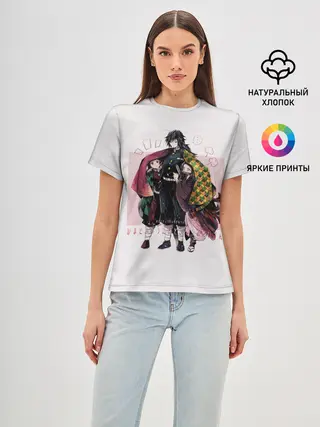Женская базовая футболка / Гию оберегает Танджиро и Незуко