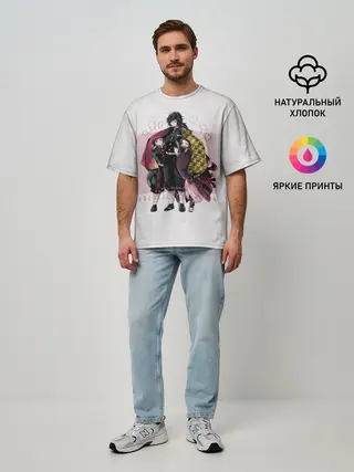 Мужская футболка оверсайз / Гию оберегает Танджиро и Незуко