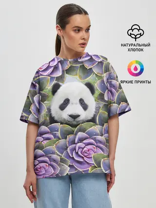 Женская футболка оверсайз / Панда среди цветов