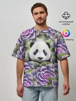 Мужская футболка оверсайз / Панда среди цветов