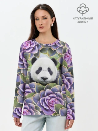 Лонгслив женский. Хлопок / Панда среди цветов